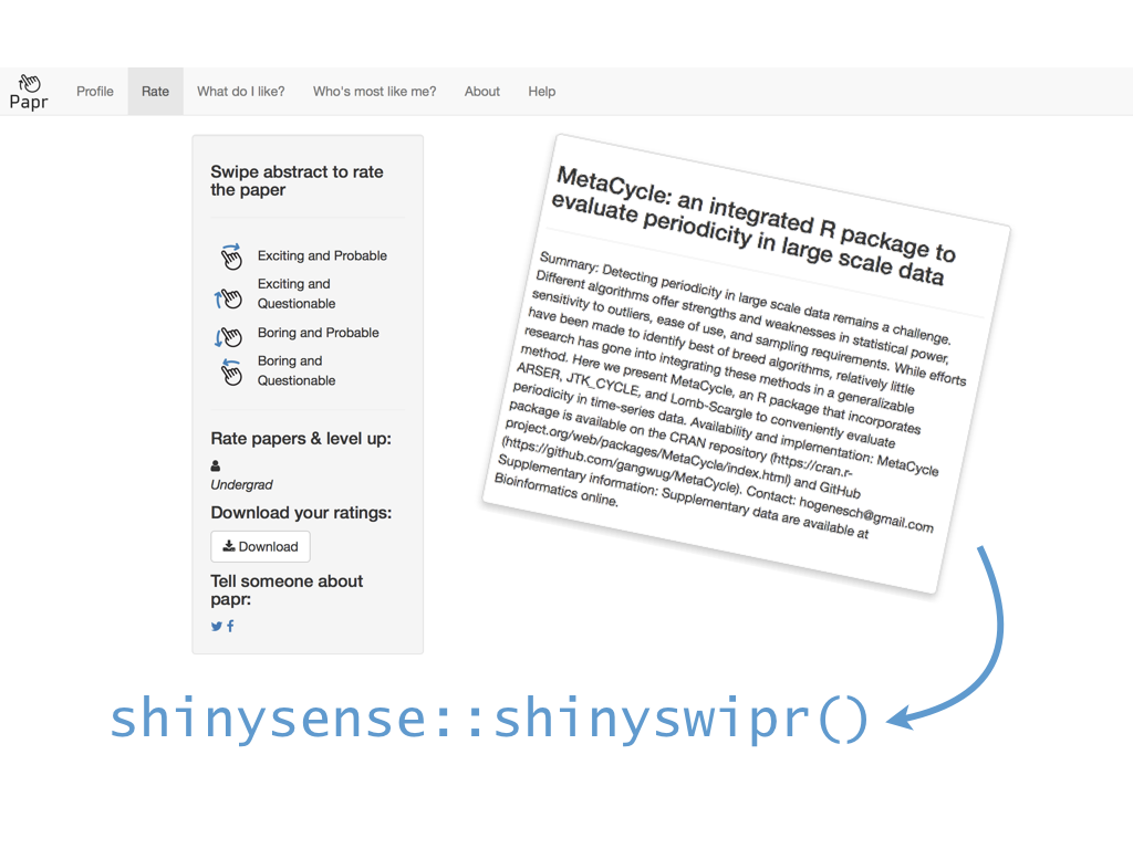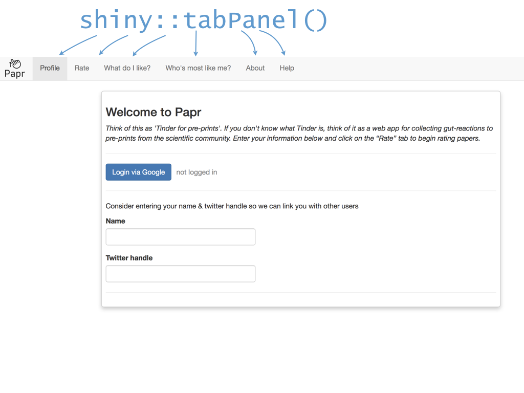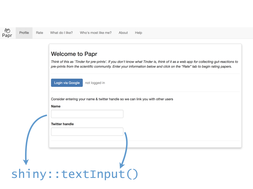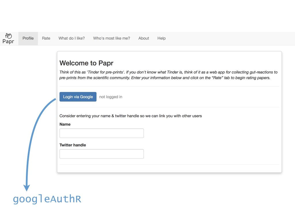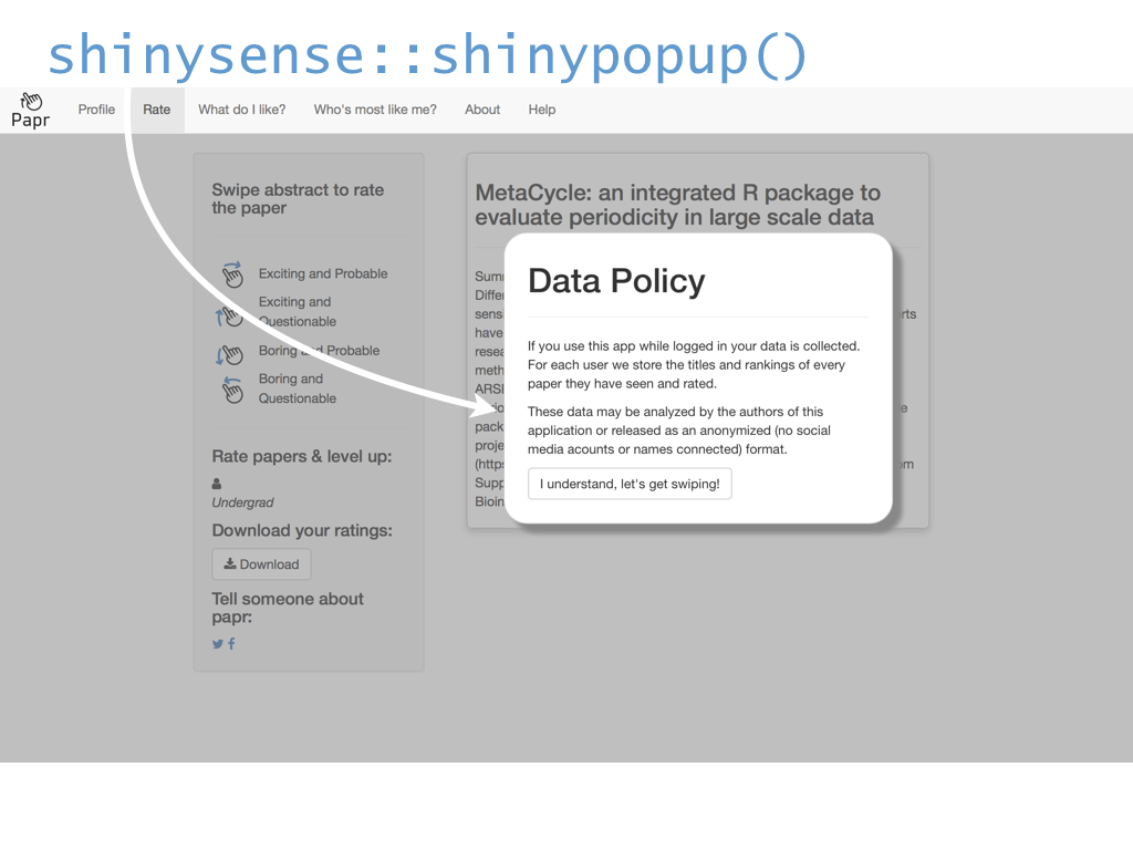 class: center, middle # papr: Tinder for pre-prints Lucy D'Agostino McGowan Nick Strayer Jeff Leek  --- class: center, middle # what is tinder?  .footnote[useR!2017 \#RChickenLadies] --- layout: true .footnote[useR!2017] --- class: center, middle # what is papr?  --- # history <i class = "fa fa-twitter"></i> <blockquote class="twitter-tweet" data-lang="en"><p lang="en" dir="ltr">I built a "tinder for academic preprints" web app: <a href="https://t.co/fZYlgkn4WL">https://t.co/fZYlgkn4WL</a> for <a href="https://twitter.com/biorxivpreprint">@biorxivpreprint</a> preprints.</p>— Jeff Leek (@jtleek) <a href="https://twitter.com/jtleek/status/782949505754861568">October 3, 2016</a></blockquote> <blockquote class="twitter-tweet" data-lang="en"><p lang="en" dir="ltr">Hilarious 😂 If only it was compatible with swiping..the tactile enjoyment of making snap judgements by swiping left/right is unrivaled <a href="https://twitter.com/hashtag/papr?src=hash">#papr</a> <a href="https://t.co/isg5hmsh7n">https://t.co/isg5hmsh7n</a></p>— Lucy 🌻 (@LucyStats) <a href="https://twitter.com/LucyStats/status/782953224420495365">October 3, 2016</a></blockquote> <blockquote class="twitter-tweet" data-lang="en"><p lang="en" dir="ltr">.<a href="https://twitter.com/LucyStats">@LucyStats</a> I'm with you, maybe <a href="https://twitter.com/jcheng">@jcheng</a> can add swiping functionality to Shiny?</p>— Jeff Leek (@jtleek) <a href="https://twitter.com/jtleek/status/782953550091542528">October 3, 2016</a></blockquote> --- # history <i class = "fa fa-twitter"></i> <blockquote class="twitter-tweet" data-lang="en"><p lang="en" dir="ltr">Agreed. <a href="https://twitter.com/jcheng">@jcheng</a> I'd appreciate it if you would make this a top priority 💁🏻</p>— Lucy 🌻 (@LucyStats) <a href="https://twitter.com/LucyStats/status/782958062378377216">October 3, 2016</a></blockquote> <blockquote class="twitter-tweet" data-lang="en"><p lang="en" dir="ltr">I'm looping you in <a href="https://twitter.com/NicholasStrayer">@NicholasStrayer</a> can you do some javascript magic to make this happen ✨💻 </p>— Lucy 🌻 (@LucyStats) <a href="https://twitter.com/LucyStats/status/782967208649580545">October 3, 2016</a> </blockquote> <blockquote class="twitter-tweet" data-lang="en"><p lang="en" dir="ltr">swipR: the tidyverse judge-a-book-by-its-cover <a href="https://twitter.com/hashtag/rstats?src=hash">#rstats</a> package.</p>— Nick Strayer (@NicholasStrayer) <a href="https://twitter.com/NicholasStrayer/status/782978330316382208">October 3, 2016</a> </blockquote> --- # history <i class = "fa fa-twitter"></i> <blockquote class="twitter-tweet" data-lang="en"><p lang="en" dir="ltr">yep done we're making it. Cube meeting at 3.</p>— Lucy 🌻 (@LucyStats) <a href="https://twitter.com/LucyStats/status/782978971596185602">October 3, 2016</a> </blockquote> <blockquote class="twitter-tweet" data-lang="en"><p lang="en" dir="ltr">Cube meeting mission accomplished <a href="https://twitter.com/hashtag/highfivingamillionangels?src=hash">#highfivingamillionangels</a> <a href="https://t.co/qibMzCD8kd">pic.twitter.com/qibMzCD8kd</a></p>— Lucy 🌻 (@LucyStats) <a href="https://twitter.com/LucyStats/status/783066294115569665">October 3, 2016</a></blockquote> --- # stats <span class="fa-stack fa-lg"> <i class="fa fa-circle fa-stack-2x"></i> <i class="fa fa-users fa-stack-1x fa-inverse"></i> </span> 13,000+ sessions <br><br> <span class="fa-stack fa-lg"> <i class="fa fa-circle fa-stack-2x"></i> <i class="fa fa-sign-in fa-stack-1x fa-inverse"></i> </span> 1,800+ unique logins <br><br> <span class="fa-stack fa-lg"> <i class="fa fa-circle fa-stack-2x"></i> <i class="fa fa-twitter fa-stack-1x fa-inverse"></i> </span> 450+ provided Twitter credentials <br><br> ---  ---  --- # unique aspects <span class="fa-stack fa-lg"> <i class="fa fa-circle fa-stack-2x"></i> <i class="fa fa-sign-in fa-stack-1x fa-inverse"></i> </span> saving data for multiple logins <br><br> <span class="fa-stack fa-lg"> <i class="fa fa-circle fa-stack-2x"></i> <i class="fa fa-laptop fa-stack-1x fa-inverse"></i> </span> running the app locally with a specific port <br><br> <span class="fa-stack fa-lg"> <i class="fa fa-circle fa-stack-2x"></i> <i class="fa fa-floppy-o fa-stack-1x fa-inverse"></i> </span> saving API credentials <br><br> --- # unique aspects <span class="fa-stack fa-lg"> <i class="fa fa-circle fa-stack-2x"></i> <i class="fa fa-hand-o-up fa-stack-1x fa-inverse"></i> </span> incorporating tactile input <br><br> <span class="fa-stack fa-lg"> <i class="fa fa-circle fa-stack-2x"></i> <i class="fa fa-thumbs-up fa-stack-1x fa-inverse"></i> </span> creating a recommender engine <br><br> --- class: center, middle [https://jhubiostatistics.shinyapps.io/papr](https://jhubiostatistics.shinyapps.io/papr/) ---  ---  --- [](https://github.com/MarkEdmondson1234/googleAuthR) --- # Google credentials  --- # Google credentials  --- # tell shiny ```r shiny::runApp(port=1221) ``` ---  ---  ---  --- # pop-up ```r library("shiny") library("shinysense") terms_content_div <- div( p("Here are some terms for you to ignore") ) ui <- fixedPage( shinypopupUI("terms", buttonText = "I understand, let's get swiping!", popupDiv = terms_content_div, "test" ) ) server <- function(input, output, session) { callModule(shinypopup, "terms", accepted = FALSE) }) ``` --- # pop-up ```r library("shiny") library("shinysense") *terms_content_div <- div( * p("Here are some terms for you to ignore") * ) ui <- fixedPage( shinypopupUI("terms", buttonText = "I understand, let's get swiping!", popupDiv = terms_content_div, "test" ) ) server <- function(input, output, session) { callModule(shinypopup, "terms", accepted = FALSE) }) ``` --- # pop-up ```r library("shiny") library("shinysense") terms_content_div <- div( p("Here are some terms for you to ignore") ) ui <- fixedPage( * shinypopupUI("terms", * buttonText = "I understand, let's get swiping!", * popupDiv = terms_content_div, * "test" ) ) server <- f
