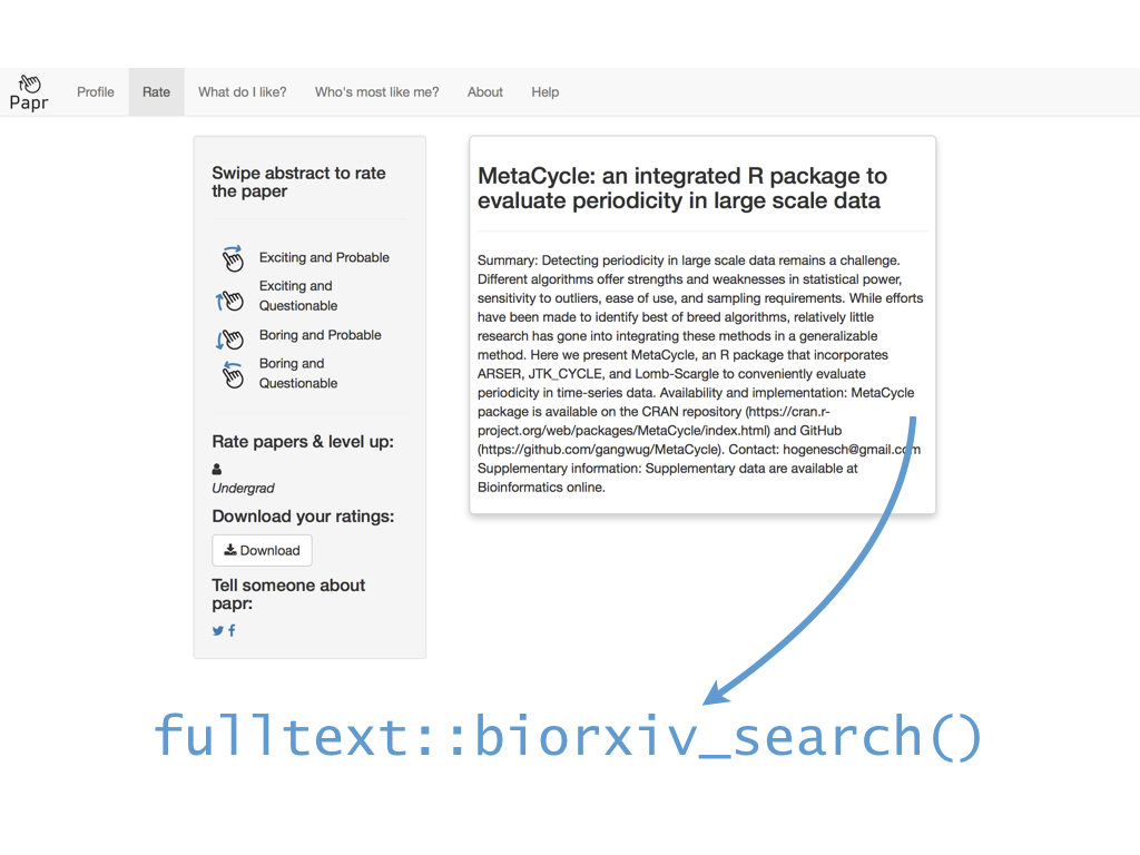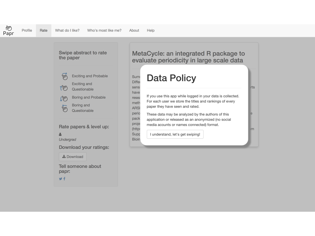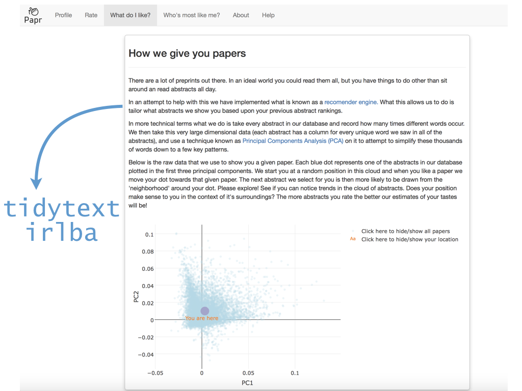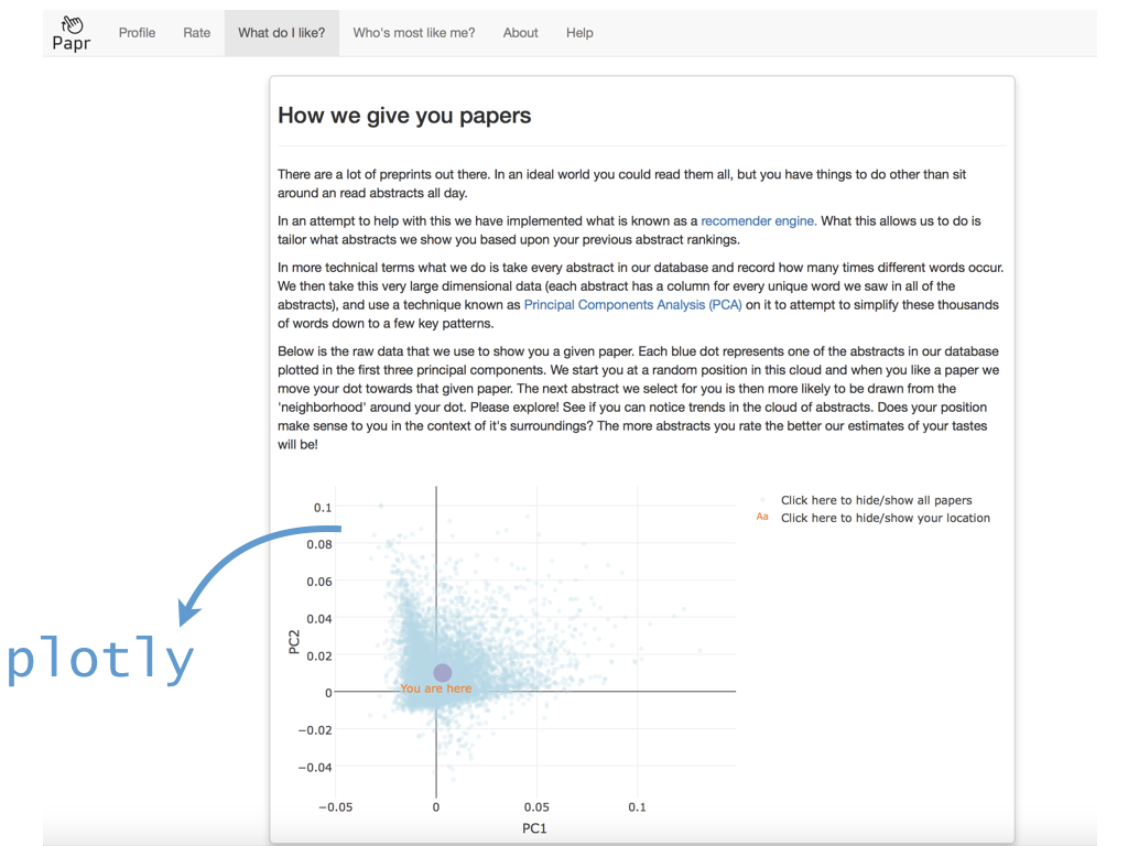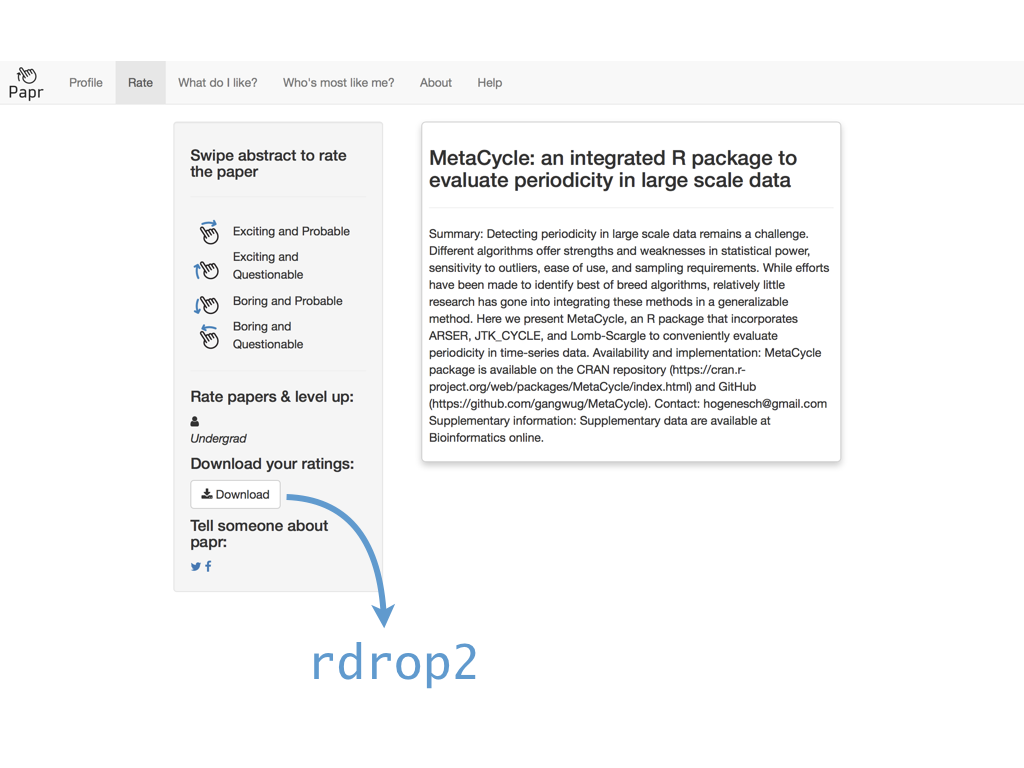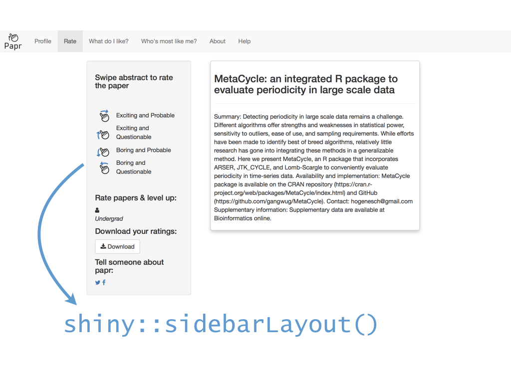 class: center, middle # papr: Tinder for pre-prints Lucy D'Agostino McGowan Nick Strayer Jeff Leek  --- class: center, middle # what is tinder?  .footnote[useR!2017 \#RChickenLadies] --- layout: true .footnote[useR!2017] --- class: center, middle # what is papr?  --- # history <i class = "fa fa-twitter"></i> <blockquote class="twitter-tweet" data-lang="en"><p lang="en" dir="ltr">I built a "tinder for academic preprints" web app: <a href="https://t.co/fZYlgkn4WL">https://t.co/fZYlgkn4WL</a> for <a href="https://twitter.com/biorxivpreprint">@biorxivpreprint</a> preprints.</p>— Jeff Leek (@jtleek) <a href="https://twitter.com/jtleek/status/782949505754861568">October 3, 2016</a></blockquote> <blockquote class="twitter-tweet" data-lang="en"><p lang="en" dir="ltr">Hilarious 😂 If only it was compatible with swiping..the tactile enjoyment of making snap judgements by swiping left/right is unrivaled <a href="https://twitter.com/hashtag/papr?src=hash">#papr</a> <a href="https://t.co/isg5hmsh7n">https://t.co/isg5hmsh7n</a></p>— Lucy 🌻 (@LucyStats) <a href="https://twitter.com/LucyStats/status/782953224420495365">October 3, 2016</a></blockquote> <blockquote class="twitter-tweet" data-lang="en"><p lang="en" dir="ltr">.<a href="https://twitter.com/LucyStats">@LucyStats</a> I'm with you, maybe <a href="https://twitter.com/jcheng">@jcheng</a> can add swiping functionality to Shiny?</p>— Jeff Leek (@jtleek) <a href="https://twitter.com/jtleek/status/782953550091542528">October 3, 2016</a></blockquote> --- # history <i class = "fa fa-twitter"></i> <blockquote class="twitter-tweet" data-lang="en"><p lang="en" dir="ltr">Agreed. <a href="https://twitter.com/jcheng">@jcheng</a> I'd appreciate it if you would make this a top priority 💁🏻</p>— Lucy 🌻 (@LucyStats) <a href="https://twitter.com/LucyStats/status/782958062378377216">October 3, 2016</a></blockquote> <blockquote class="twitter-tweet" data-lang="en"><p lang="en" dir="ltr">I'm looping you in <a href="https://twitter.com/NicholasStrayer">@NicholasStrayer</a> can you do some javascript magic to make this happen ✨💻 </p>— Lucy 🌻 (@LucyStats) <a href="https://twitter.com/LucyStats/status/782967208649580545">October 3, 2016</a> </blockquote> <blockquote class="twitter-tweet" data-lang="en"><p lang="en" dir="ltr">swipR: the tidyverse judge-a-book-by-its-cover <a href="https://twitter.com/hashtag/rstats?src=hash">#rstats</a> package.</p>— Nick Strayer (@NicholasStrayer) <a href="https://twitter.com/NicholasStrayer/status/782978330316382208">October 3, 2016</a> </blockquote> --- # history <i class = "fa fa-twitter"></i> <blockquote class="twitter-tweet" data-lang="en"><p lang="en" dir="ltr">yep done we're making it. Cube meeting at 3.</p>— Lucy 🌻 (@LucyStats) <a href="https://twitter.com/LucyStats/status/782978971596185602">October 3, 2016</a> </blockquote> <blockquote class="twitter-tweet" data-lang="en"><p lang="en" dir="ltr">Cube meeting mission accomplished <a href="https://twitter.com/hashtag/highfivingamillionangels?src=hash">#highfivingamillionangels</a> <a href="https://t.co/qibMzCD8kd">pic.twitter.com/qibMzCD8kd</a></p>— Lucy 🌻 (@LucyStats) <a href="https://twitter.com/LucyStats/status/783066294115569665">October 3, 2016</a></blockquote> --- # stats <span class="fa-stack fa-lg"> <i class="fa fa-circle fa-stack-2x"></i> <i class="fa fa-users fa-stack-1x fa-inverse"></i> </span> 13,000+ sessions <br><br> <span class="fa-stack fa-lg"> <i class="fa fa-circle fa-stack-2x"></i> <i class="fa fa-sign-in fa-stack-1x fa-inverse"></i> </span> 1,800+ unique logins <br><br> <span class="fa-stack fa-lg"> <i class="fa fa-circle fa-stack-2x"></i> <i class="fa fa-twitter fa-stack-1x fa-inverse"></i> </span> 450+ provided Twitter credentials <br><br> ---  ---  --- # unique aspects <span class="fa-stack fa-lg"> <i class="fa fa-circle fa-stack-2x"></i> <i class="fa fa-sign-in fa-stack-1x fa-inverse"></i> </span> saving data for multiple logins <br><br> <span class="fa-stack fa-lg"> <i class="fa fa-circle fa-stack-2x"></i> <i class="fa fa-laptop fa-stack-1x fa-inverse"></i> </span> running the app locally with a specific port <br><br> <span class="fa-stack fa-lg"> <i class="fa fa-circle fa-stack-2x"></i> <i class="fa fa-floppy-o fa-stack-1x fa-inverse"></i> </span> saving API credentials <br><br> --- # unique aspects <span class="fa-stack fa-lg"> <i class="fa fa-circle fa-stack-2x"></i> <i class="fa fa-hand-o-up fa-stack-1x fa-inverse"></i> </span> incorporating tactile input <br><br> <span class="fa-stack fa-lg"> <i class="fa fa-circle fa-stack-2x"></i> <i class="fa fa-thumbs-up fa-stack-1x fa-inverse"></i> </span> creating a recommender engine <br><br> --- class: center, middle [https://jhubiostatistics.shinyapps.io/papr](https://jhubiostatistics.shinyapps.io/papr/) ---  ---  --- [](https://github.com/MarkEdmondson1234/googleAuthR) --- # Google credentials  --- # Google credentials  --- # tell shiny ```r shiny::runApp(port=1221) ``` ---  ---  ---  --- # pop-up ```r library("shiny") library("shinysense") terms_content_div <- div( p("Here are some terms for you to ignore") ) ui <- fixedPage( shinypopupUI("terms", buttonText = "I understand, let's get swiping!", popupDiv = terms_content_div, "test" ) ) server <- function(input, output, session) { callModule(shinypopup, "terms", accepted = FALSE) }) ``` --- # pop-up ```r library("shiny") library("shinysense") *terms_content_div <- div( * p("Here are some terms for you to ignore") * ) ui <- fixedPage( shinypopupUI("terms", buttonText = "I understand, let's get swiping!", popupDiv = terms_content_div, "test" ) ) server <- function(input, output, session) { callModule(shinypopup, "terms", accepted = FALSE) }) ``` --- # pop-up ```r library("shiny") library("shinysense") terms_content_div <- div( p("Here are some terms for you to ignore") ) ui <- fixedPage( * shinypopupUI("terms", * buttonText = "I understand, let's get swiping!", * popupDiv = terms_content_div, * "test" ) ) server <- f