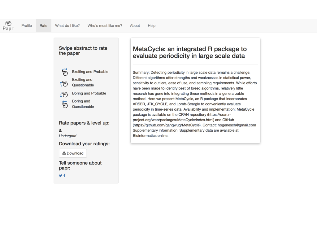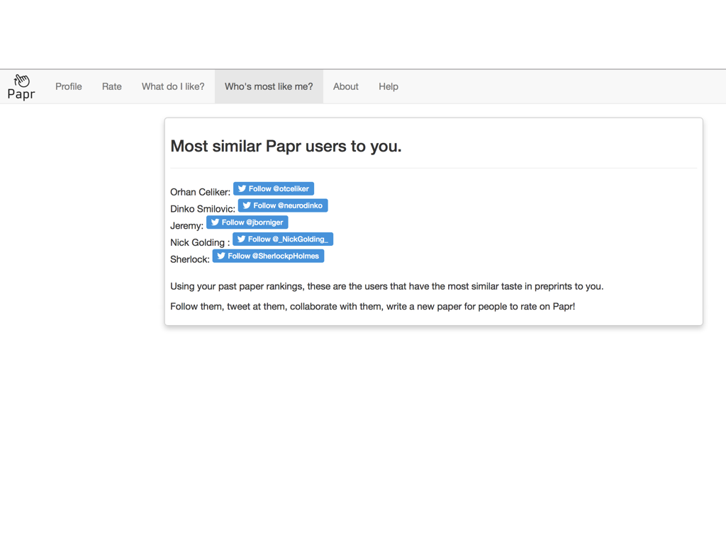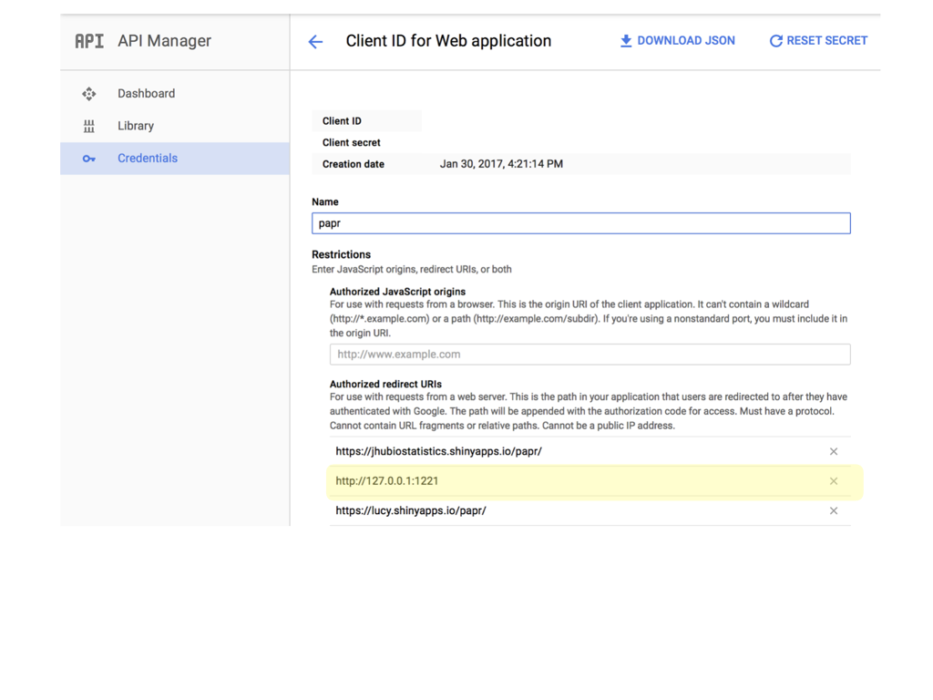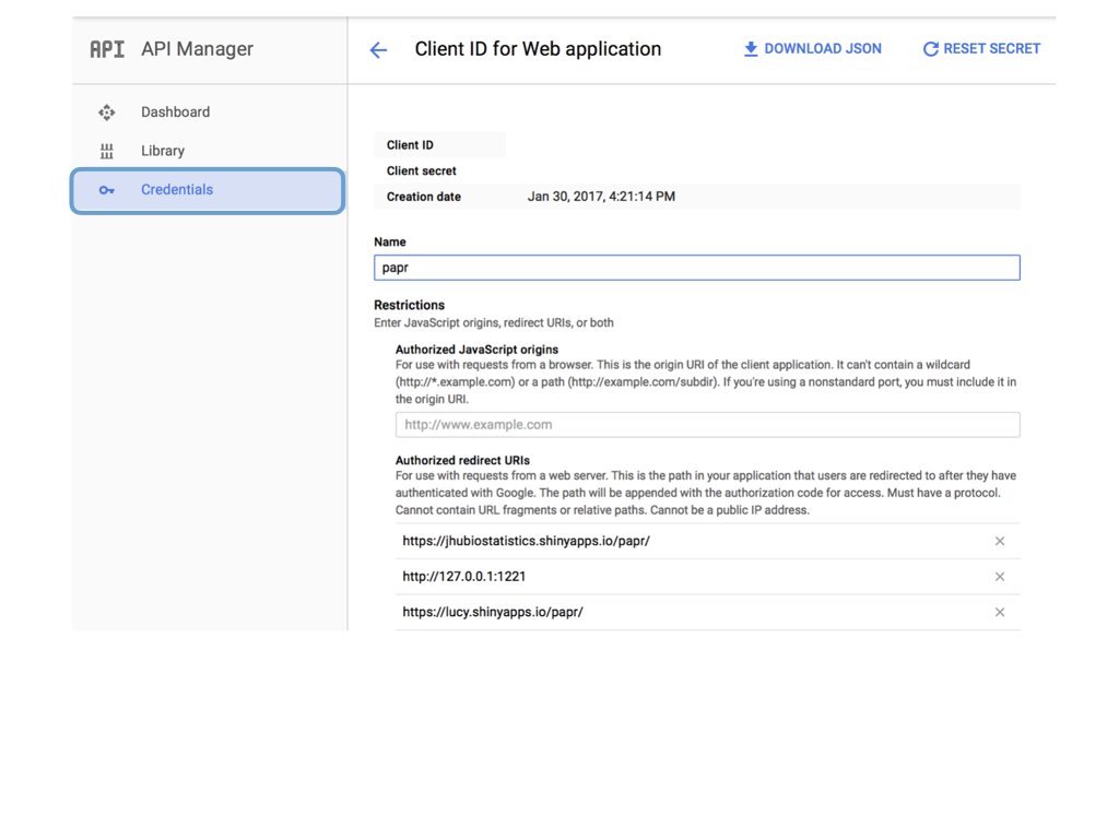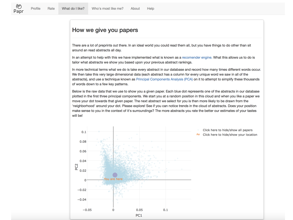 class: center, middle # papr: Tinder for pre-prints Lucy D'Agostino McGowan Nick Strayer Jeff Leek  --- class: center, middle # what is tinder?  .footnote[useR!2017 \#RChickenLadies] --- layout: true .footnote[useR!2017] --- class: center, middle # what is papr?  --- # history <i class = "fa fa-twitter"></i> <blockquote class="twitter-tweet" data-lang="en"><p lang="en" dir="ltr">I built a "tinder for academic preprints" web app: <a href="https://t.co/fZYlgkn4WL">https://t.co/fZYlgkn4WL</a> for <a href="https://twitter.com/biorxivpreprint">@biorxivpreprint</a> preprints.</p>— Jeff Leek (@jtleek) <a href="https://twitter.com/jtleek/status/782949505754861568">October 3, 2016</a></blockquote> <blockquote class="twitter-tweet" data-lang="en"><p lang="en" dir="ltr">Hilarious 😂 If only it was compatible with swiping..the tactile enjoyment of making snap judgements by swiping left/right is unrivaled <a href="https://twitter.com/hashtag/papr?src=hash">#papr</a> <a href="https://t.co/isg5hmsh7n">https://t.co/isg5hmsh7n</a></p>— Lucy 🌻 (@LucyStats) <a href="https://twitter.com/LucyStats/status/782953224420495365">October 3, 2016</a></blockquote> <blockquote class="twitter-tweet" data-lang="en"><p lang="en" dir="ltr">.<a href="https://twitter.com/LucyStats">@LucyStats</a> I'm with you, maybe <a href="https://twitter.com/jcheng">@jcheng</a> can add swiping functionality to Shiny?</p>— Jeff Leek (@jtleek) <a href="https://twitter.com/jtleek/status/782953550091542528">October 3, 2016</a></blockquote> --- # history <i class = "fa fa-twitter"></i> <blockquote class="twitter-tweet" data-lang="en"><p lang="en" dir="ltr">Agreed. <a href="https://twitter.com/jcheng">@jcheng</a> I'd appreciate it if you would make this a top priority 💁🏻</p>— Lucy 🌻 (@LucyStats) <a href="https://twitter.com/LucyStats/status/782958062378377216">October 3, 2016</a></blockquote> <blockquote class="twitter-tweet" data-lang="en"><p lang="en" dir="ltr">I'm looping you in <a href="https://twitter.com/NicholasStrayer">@NicholasStrayer</a> can you do some javascript magic to make this happen ✨💻 </p>— Lucy 🌻 (@LucyStats) <a href="https://twitter.com/LucyStats/status/782967208649580545">October 3, 2016</a> </blockquote> <blockquote class="twitter-tweet" data-lang="en"><p lang="en" dir="ltr">swipR: the tidyverse judge-a-book-by-its-cover <a href="https://twitter.com/hashtag/rstats?src=hash">#rstats</a> package.</p>— Nick Strayer (@NicholasStrayer) <a href="https://twitter.com/NicholasStrayer/status/782978330316382208">October 3, 2016</a> </blockquote> --- # history <i class = "fa fa-twitter"></i> <blockquote class="twitter-tweet" data-lang="en"><p lang="en" dir="ltr">yep done we're making it. Cube meeting at 3.</p>— Lucy 🌻 (@LucyStats) <a href="https://twitter.com/LucyStats/status/782978971596185602">October 3, 2016</a> </blockquote> <blockquote class="twitter-tweet" data-lang="en"><p lang="en" dir="ltr">Cube meeting mission accomplished <a href="https://twitter.com/hashtag/highfivingamillionangels?src=hash">#highfivingamillionangels</a> <a href="https://t.co/qibMzCD8kd">pic.twitter.com/qibMzCD8kd</a></p>— Lucy 🌻 (@LucyStats) <a href="https://twitter.com/LucyStats/status/783066294115569665">October 3, 2016</a></blockquote> --- # stats <span class="fa-stack fa-lg"> <i class="fa fa-circle fa-stack-2x"></i> <i class="fa fa-users fa-stack-1x fa-inverse"></i> </span> 13,000+ sessions <br><br> <span class="fa-stack fa-lg"> <i class="fa fa-circle fa-stack-2x"></i> <i class="fa fa-sign-in fa-stack-1x fa-inverse"></i> </span> 1,800+ unique logins <br><br> <span class="fa-stack fa-lg"> <i class="fa fa-circle fa-stack-2x"></i> <i class="fa fa-twitter fa-stack-1x fa-inverse"></i> </span> 450+ provided Twitter credentials <br><br> ---  ---  --- # unique aspects <span class="fa-stack fa-lg"> <i class="fa fa-circle fa-stack-2x"></i> <i class="fa fa-sign-in fa-stack-1x fa-inverse"></i> </span> saving data for multiple logins <br><br> <span class="fa-stack fa-lg"> <i class="fa fa-circle fa-stack-2x"></i> <i class="fa fa-laptop fa-stack-1x fa-inverse"></i> </span> running the app locally with a specific port <br><br> <span class="fa-stack fa-lg"> <i class="fa fa-circle fa-stack-2x"></i> <i class="fa fa-floppy-o fa-stack-1x fa-inverse"></i> </span> saving API credentials <br><br> --- # unique aspects <span class="fa-stack fa-lg"> <i class="fa fa-circle fa-stack-2x"></i> <i class="fa fa-hand-o-up fa-stack-1x fa-inverse"></i> </span> incorporating tactile input <br><br> <span class="fa-stack fa-lg"> <i class="fa fa-circle fa-stack-2x"></i> <i class="fa fa-thumbs-up fa-stack-1x fa-inverse"></i> </span> creating a recommender engine <br><br> --- class: center, middle [https://jhubiostatistics.shinyapps.io/papr](https://jhubiostatistics.shinyapps.io/papr/) ---  ---  --- [](https://github.com/MarkEdmondson1234/googleAuthR) --- # Google credentials  --- # Google credentials  --- # tell shiny ```r shiny::runApp(port=1221) ``` ---  ---  ---  --- # pop-up ```r library("shiny") library("shinysense") terms_content_div <- div( p("Here are some terms for you to ignore") ) ui <- fixedPage( shinypopupUI("terms", buttonText = "I understand, let's get swiping!", popupDiv = terms_content_div, "test" ) ) server <- function(input, output, session) { callModule(shinypopup, "terms", accepted = FALSE) }) ``` --- # pop-up ```r library("shiny") library("shinysense") *terms_content_div <- div( * p("Here are some terms for you to ignore") * ) ui <- fixedPage( shinypopupUI("terms", buttonText = "I understand, let's get swiping!", popupDiv = terms_content_div, "test" ) ) server <- function(input, output, session) { callModule(shinypopup, "terms", accepted = FALSE) }) ``` --- # pop-up ```r library("shiny") library("shinysense") terms_content_div <- div( p("Here are some terms for you to ignore") ) ui <- fixedPage( * shinypopupUI("terms", * buttonText = "I understand, let's get swiping!", * popupDiv = terms_content_div, * "test" ) ) server <- f