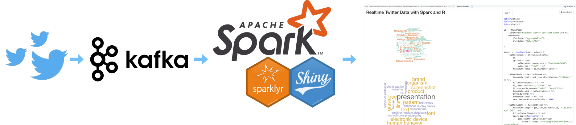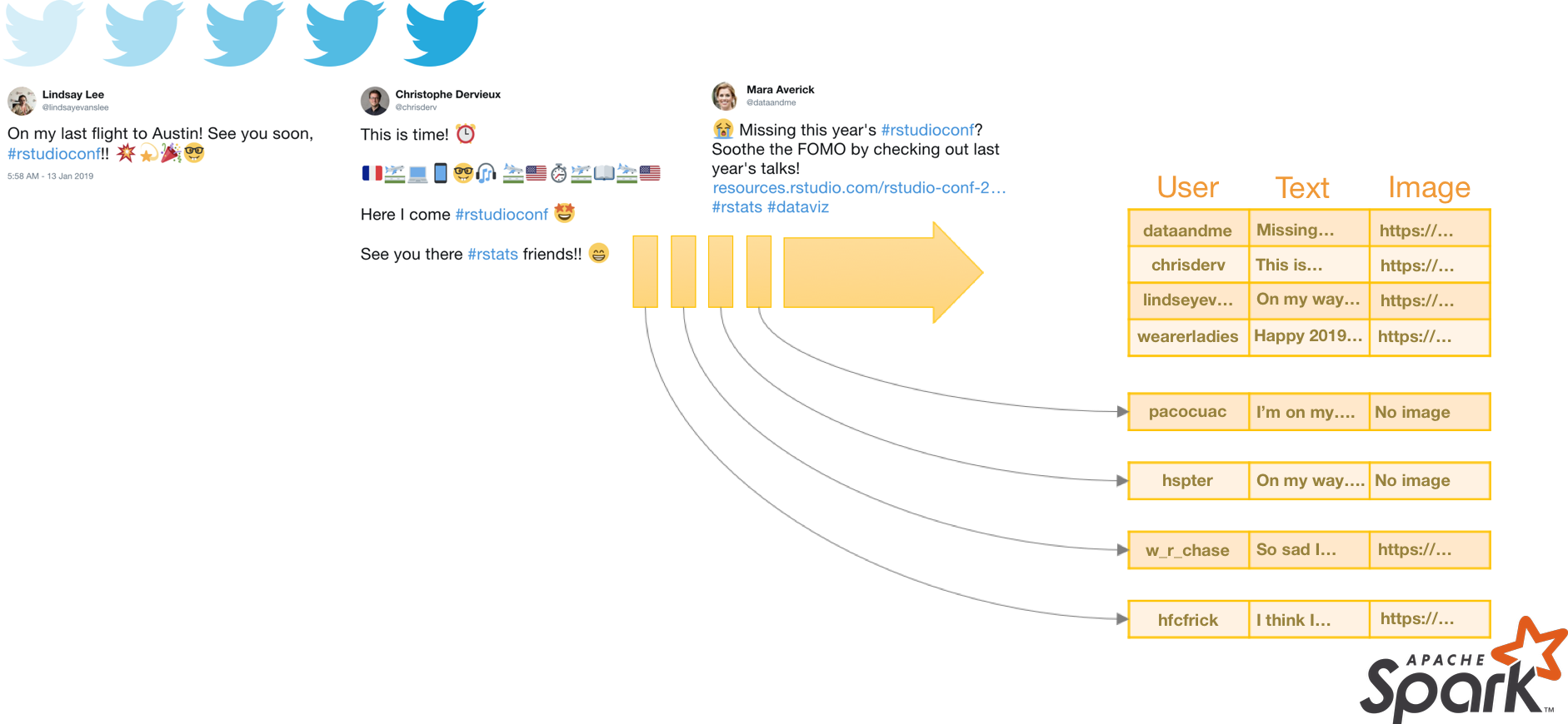 class: center, middle, inverse, title-slide # Scaling R with Spark ## using sparklyr ### Javier Luraschi ### 01/17/2019 --- class: panel-wide-slide, left # What to do when code is slow? ```r mtcars %>% lm(mpg ~ wt + cyl, .) ``` -- ```r # Sample mtcars %>% dplyr::sample_n(10) %>% lm(mpg ~ wt + cyl, .) ``` -- ```r # Profile profvis::profvis(mtcars %>% lm(mpg ~ wt + cyl, .)) ``` -- ```r # Scale Up cloudml::cloudml_train("train.R") ``` -- ```r # Scale Out mtcars_tbl %>% sparklyr::ml_linear_regression(mpg ~ wt + cyl) ``` -- .small-note[**Note:** There are many more ways to sample, scale-up and scale-out.] --- class: panel-narrow-slide, left # Scaling Out with R and Spark  ```r # Scale Out mtcars_tbl %>% sparklyr::ml_linear_regression(mpg ~ wt + cyl) ``` --- class: panel-narrow-slide, left # How to use R with Spark? ```r library(sparklyr) # R Interface to Apache Spark spark_install() # Install Apache Spark sc <- spark_connect(master = "local") # Connect to Spark cluster ``` -- ```r cars_tbl <- spark_read_csv(sc, "cars", "mtcars/") # Read data in Spark summarize(cars_tbl, n = n()) # Count records with dplyr dbGetQuery(sc, "SELECT count(*) FROM cars") # Count records with DBI ``` -- ```r ml_linear_regression(cars_tbl, mpg ~ wt + cyl) # Perform linear regression ``` -- ```r pipeline <- ml_pipeline(sc) %>% # Define Spark pipeline ft_r_formula(mpg ~ wt + cyl) %>% # Add formula transformation ml_linear_regression() # Add model to pipeline fitted <- ml_fit(pipeline, cars_tbl) # Fit pipeline ``` -- ```r spark_context(sc) %>% invoke("version") # Extend sparklyr with Scala spark_apply(cars_tbl, nrow) # Extend sparklyr with R ``` --- class: panel-narrow-slide, left # What about realtime data?  --- class: panel-narrow-slide, left # Spark Structured Streams ```r cars_str <- stream_read_csv(sc, "mtcars/", "cars") # Read stream in Spark ``` -- ```r out_str <- summarize(cars_str, n = n()) # Count records with dplyr out_str <- dbGetQuery(sc, "SELECT count(*) FROM cars") # Count records with DBI ``` -- ```r out_str <- ml_transform(fitted, cars_str) # Apply pipeline to stream ``` -- ```r out_str <- spark_apply(cars_str, nrow) # Extend streams with R ``` -- ```r stream_write_csv(out_str, "output/") # Write as a CSV stream reactiveSpark(out_str) # Use as a Shiny reactive ``` --- class: panel-narrow-slide, left # Streaming with Spark, Kafka and Shiny > Apache Kafka is an open-source stream-processing software platform that provides a unified, high-throughput and low-latency for handling real-time data feeds. --  --- class: panel-narrow-slide, left # What's new in Spark and R? **Streams**, **MLeap**, **Kubernetes** and **RStudio 1.2** integration. --  --- class: panel-narrow-slide, left # What are we currently working on? ### - Faster data transfer with Apache Arrow: [pull/1611](https://github.com/rstudio/sparklyr/pull/1611). -- ### - [XGBoost](https://github.com/rstudio/sparkxgb) on Spark: [rstudio/sparkxgb](https://github.com/rstudio/sparkxgb). --- class: panel-narrow-slide, left # Arrow on Spark > .small-quote[Arrow is a cross-language development platform for in-memory data.] -- ```r devtools::install_github("apache/arrow", subdir = "r", ref = "dc5df8f") devtools::install_github("rstudio/sparklyr") library(arrow) library(sparklyr) ``` -- .pull-left[] .pull-right[] --- class: panel-narrow-slide, left # XGBoost on Spark > sparkxgb is a sparklyr extension that provides an interface to XGBoost on Spark. -- ```r devtools::install_github("rstudio/sparkxgb") library(sparkxgb) ``` -- ```r iris_tbl <- sdf_copy_to(sc, iris) xgb_model <- xgboost_classifier( iris_tbl, Species ~ ., objective = "multi:softprob", num_class = 3, num_round = 50, max_depth = 4 ) xgb_model %>% ml_predict(iris_tbl) %>% glimpse() ``` --- class: panel-wide-slide, left # Thank you! ### **Docs**: .resource-link[spark.rstudio.com] ### **Blog**: blog.rstudio.com/tags/sparklyr ### **R Help**: community.rstudio.com ### **Spark Help**: stackoverflow.com/tags/sparklyr ### **Issues**: github.com/rstudio/sparklyr/issues ### **Chat**: gitter.im/rstudio.sparklyr