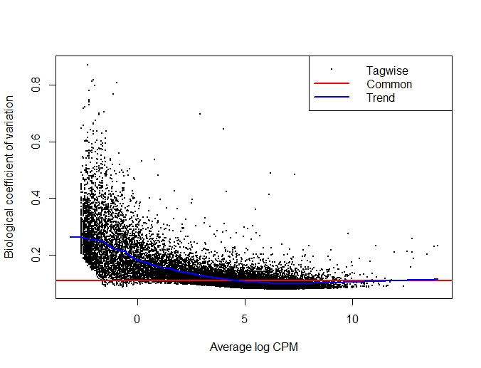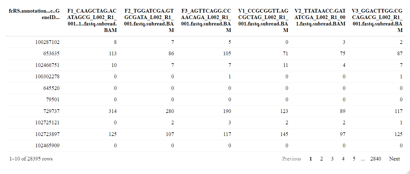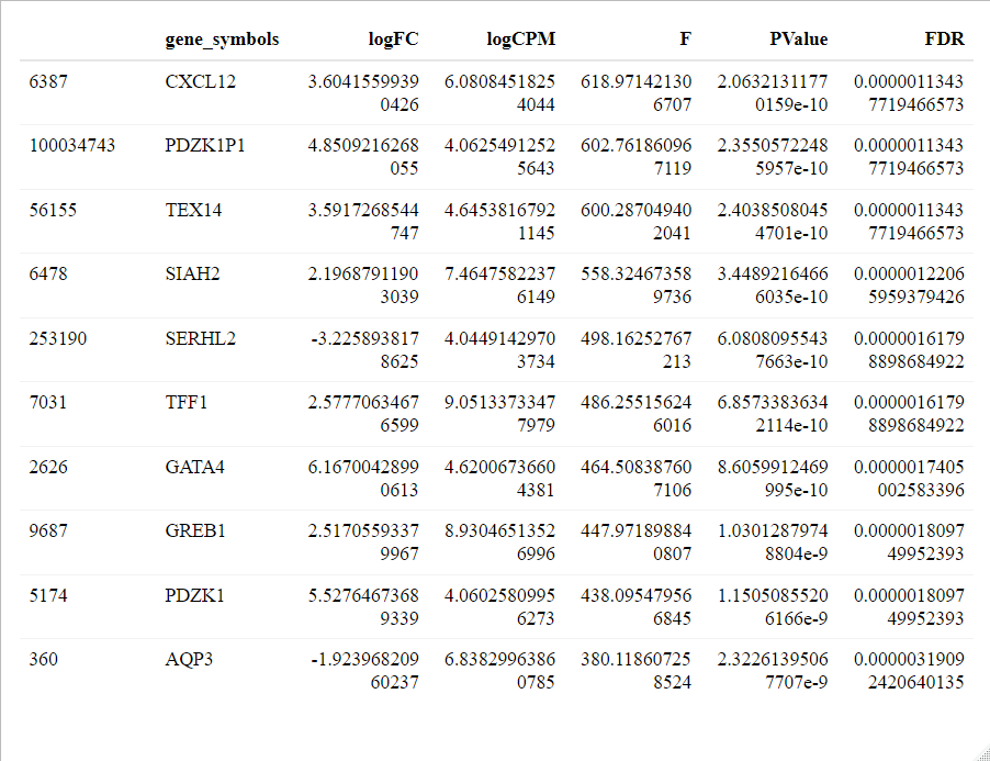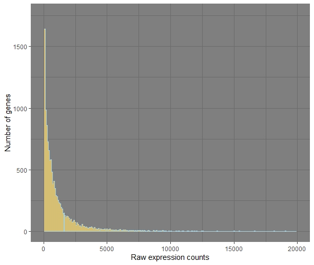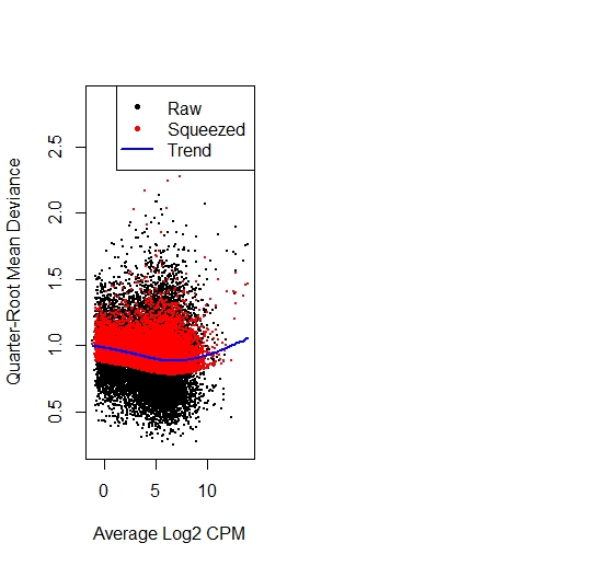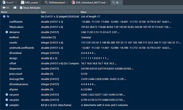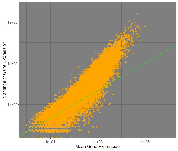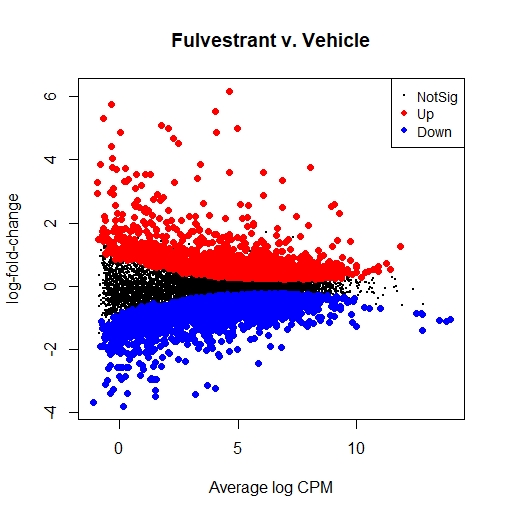 class: center, middle, inverse, title-slide # Differential Gene Expression Analysis of Fulvestrant-Treated MCF-7 RNA-seq Data ## Processed and Analyzed with RSubread and EdgeR ### Robert Bartolini ### University of Massachusetts Boston ### 2020/12/22 --- ```r #Rsubread builds reference genome index, maps sequence reads to annotated index library(Rsubread) #For DGE analysis and visualization library(edgeR) #ggplot2 library(tidyverse) #interactive MD plot w/ gene-wise expression library(Glimma) #top gene table library(reactable) #annotation of top gene table library(annotate) library(org.Hs.eg.db) ``` --- ```r ####The purpose of the workflow is to find differentially expressed genes ##from a RNA-seq data of Estrogen-receptor+ breast cancer cell lines #(MCF-7), a group treated with #fulvestrant (estrogen receptor antagonist) and a vehicle group. #Data obtained from: #https://www.ncbi.nlm.nih.gov/geo/query/acc.cgi?acc=GSE136823 #courtesy of:Zeynep Madak-Erdogan @ University of Illinois at Urbana #data was downloaded from Sequence Read Archive via #Amazon Web Services S3 could system #build list of the raw sequence reads (data obtained from SRA) #source: https://www.ncbi.nlm.nih.gov/geo/query/acc.cgi?acc=GSE136823 #credit: Zeynep Madak-Erdogan fastq.files <- list.files(path = "rnaseq/", pattern = ".fastq$", full.names = TRUE) ##abbreviate sample names fastq.abbrv <- substr(fastq.files, start = 8, stop = 9) ``` --- ```r ############################################################# ####### __ ___ ____ _ _ ___ _ _ ____ ####### ####### \ \ / / \ | _ \| \ | |_ _| \ | |/ ___| ####### ####### \ \ /\ / / _ \ | |_) | \| || || \| | | _ ####### ####### \ V V / ___ \| _ <| |\ || || |\ | |_| | ####### ####### \_/\_/_/ \_\_| \_\_| \_|___|_| \_|\____| ####### #Index Building & Gene Mapping is Computationally Intensive!! ###TAKES HOURS @ 8GB/RAM ###Enter at your own RISK!!ლ(ಠ益ಠლ) #build the index - this takes the entire human genome, decompresses it #and builds a hash table of key-value pairs of 16-bp sequences (keys) #are assigned to chromosomal locations (values) #this will be used to map the rna-seq reads to reference genome from: #GENCODE database via the following links: #ftp://ftp.ebi.ac.uk/pub/databases/gencode/Gencode_human/release_28/GRCh38.primary_assembly.genome.fa.gz # #index is in directory buildindex(basename="Ebi_Homo_Sapien_Index",reference="GRCh38.primary_assembly.genome.fa.gz", gappedIndex = TRUE, indexSplit = TRUE) ##################Rsubread Alignment################ ##### align() creates an index hash table #that mediates the mapping of sequence reads to the reference index align.stat <- align(index = "Ebi_Homo_Sapien_Index", readfile1 = fastq.files) #Output is .BAM file this is used for #normalizing and counting the sequence reads ``` --- ```r #build a vector of themapped read file names bam.files <- list.files(path = "rnaseq/", pattern = ".BAM$", full.names = TRUE) #featureCounts generates a matrix of read counts of mapped genes in each sample #strandSpecific = 2 because 'TruSeq Stranded mRNAseq Sample Prep kit' (Illumina). #Read 1 aligns to the ANTISENSE strand and Read 2 aligns to the SENSE strand, #this maps the mrna sequence to the annotated exons within inbuilt annotation fcRS <- featureCounts(bam.files, annot.inbuilt="hg38", strandSpecific = 2) ``` --- ```r ###This chunk is a files that were written for downstream processing or analysis ####write counts to table fcRS_counts <- fcRS$counts #output a txt file of count data write.table(x=data.frame(fcRS$annotation[,c("GeneID","Length")],fcRS$counts,stringsAsFactors=FALSE),file="RScountsEBI.txt",quote=FALSE,sep="\t",row.names=FALSE) #For edgeR quasi-likelihood DGE write.table(x=data.frame(fcRS$annotation[,c("GeneID")],fcRS$counts,stringsAsFactors=FALSE),file="counts.txt",quote=FALSE,sep="\t",row.names=FALSE) #load data into a table (for count distribution) EBI_RStrandedCountTable <- read.table(file = 'RScountsEBI.txt', header = TRUE) #load data into a table for quasi-likelihood DGE CountTable <- read.table(file = 'counts.txt', header = TRUE) #IMAGE NEXT SLIDE ``` --- <!-- --> --- ```r #######HISTOGRAM OF Fulvestrant Sample 1 gene expression v. # of genes ggplot(EBI_RStrandedCountTable) + geom_histogram(aes(x = F1_CAAGCTAG.ACATAGCG_L002_R1_001..1..fastq.subread.BAM), stat = "bin", bins = 250, colour = "lightblue", fill = "orange") + xlab("Raw expression counts") + ylab("Number of genes")+ xlim(0,20000)+ ylim(0,1760)+ theme_dark() ###PLOT ON NEXT SLIDE ``` --- <!-- --> --- ```r #scatter-plot to display mean-variance relationship ####write counts to table (needed for mean/variance dependence plot and #later use in contrast matrix) fcRS_counts <- fcRS$counts #generate a vector of gene-wise mean expression mean <- apply(fcRS_counts[,1:6], 1, mean) #The second argument '1' of 'apply' function indicates the function being applied to rows. Use '2' if applied to columns #Generate a vector of gene-wise variance variance <- apply(fcRS_counts[,1:6], 1, var) #assemble mean and variance into a dataframe MeanVariancedf <- data.frame(mean, variance) #scatter-plot to display mean-variance relationship ggplot(MeanVariancedf) + geom_point(aes(x=mean, y=variance), colour = "orange", alpha = .8) + scale_y_log10(limits = c(1,1e9)) + scale_x_log10(limits = c(1,1e6)) + geom_abline(intercept = 0, slope = 1, color="green")+ xlab("Mean Gene Expression")+ ylab("Variance of Gene Expression")+ theme_dark() ``` --- <!-- --> --- ```r #Prepare for PCA Plot #Create a DGEList object from featureCount object for downstream analysis DGEfulvestrant <- DGEList(counts=fcRS$counts, genes=fcRS$annotation[,c("GeneID","Length")]) ####Filter to keep genes which had more than 10 reads per million mapped #reads in at least two libraries. FilteredGenes <- rowSums(cpm(DGEfulvestrant) > 10) >= 2 #write to dataframe DGEfulvestrant <- DGEfulvestrant[FilteredGenes,] ##Normalization. Perform voom normalization: Adjusts for between sample #sequence library size so statisical ana