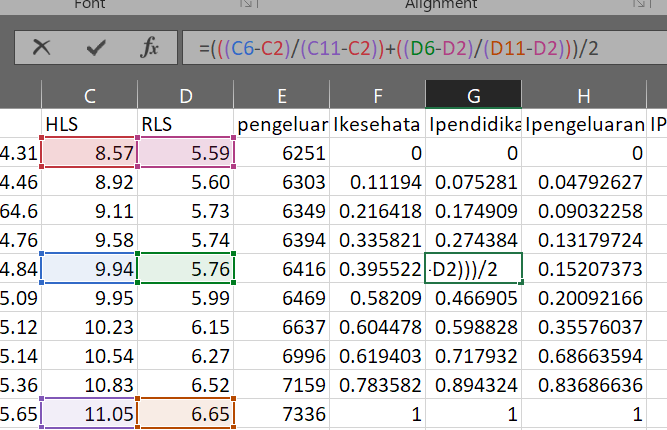 dapat kita lihat dari rumus rumus diatas selalu ada nilai min dan max yg berarti misal untuk menentukan index data. berarti misal rumus tersebut bisa dibaca: data sekarang kurang data min dibagi data max dikurangi data max(jumlah). yg berarti semua index apabila data baru berada diantara data min & max maka hasilnya 0~1 apabila diatas max maka >1 apabila dibawah min maka <0 (bps menyebut ini standarisasi) sebenarnya AHH,HLS,RLS dan pengeluaran perkapita tetap diatas 1 dan itu memiliki hitungan tersendiri penentuan data min& max itu bukan dari yg posisi data terbawah dg data tertinggi oleh sebab itu data yg kami ambil salah karena saya hanya mengambil dari 2014~2019 seharusnya dari 2010~2019 sesuai bps dan tidak hanya provinsi papua saja namun seluruh kabupaten di provinsi papua. yg ada di provinsi papua itu rata rata dari semua kabupaten. nah itulah yg membuat kelompok kami bingung saat menghitung IPM kok hasilnya beda sesuai di bps sehingga saat menghitung nilai ipm hasilnya berbeda dg aslinya karena diluar thn 2014 ada data terendah / tertinggi yg digunakan untuk membuat IPM sebelumnya jadi hasil IPM saya berbeda. jadi datanya seperti ini kita bisa menggunakan fungsi di excell sehingga tidak perlu membuatnya disini cth:
