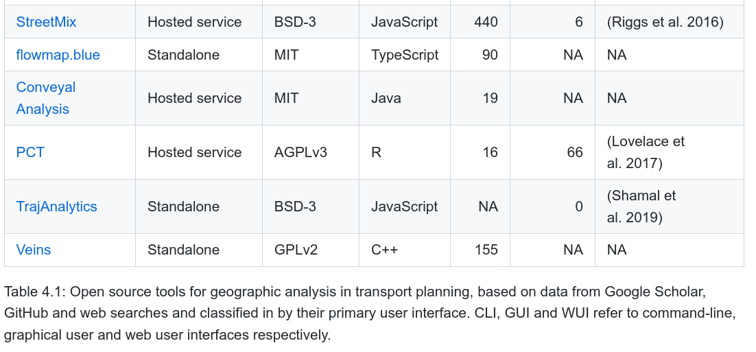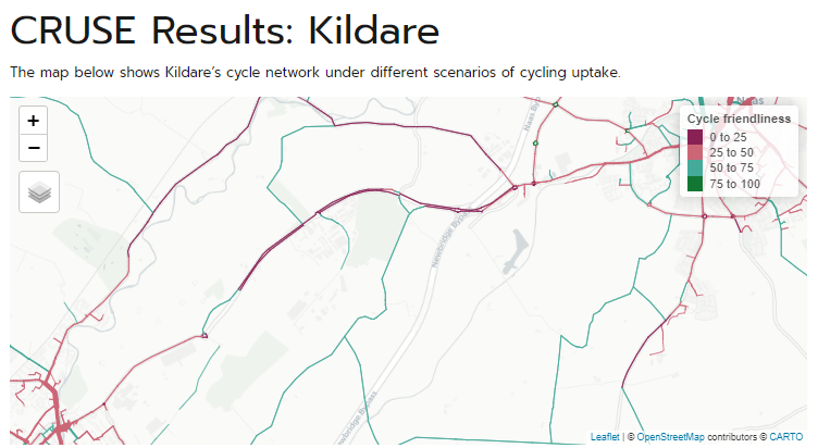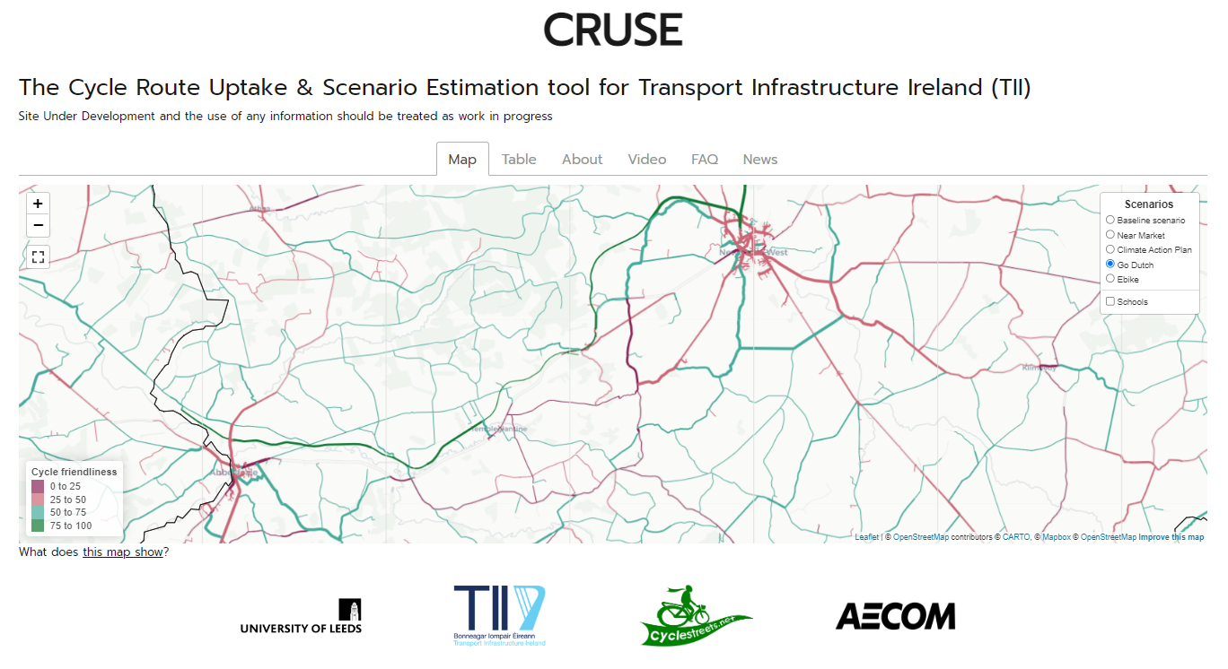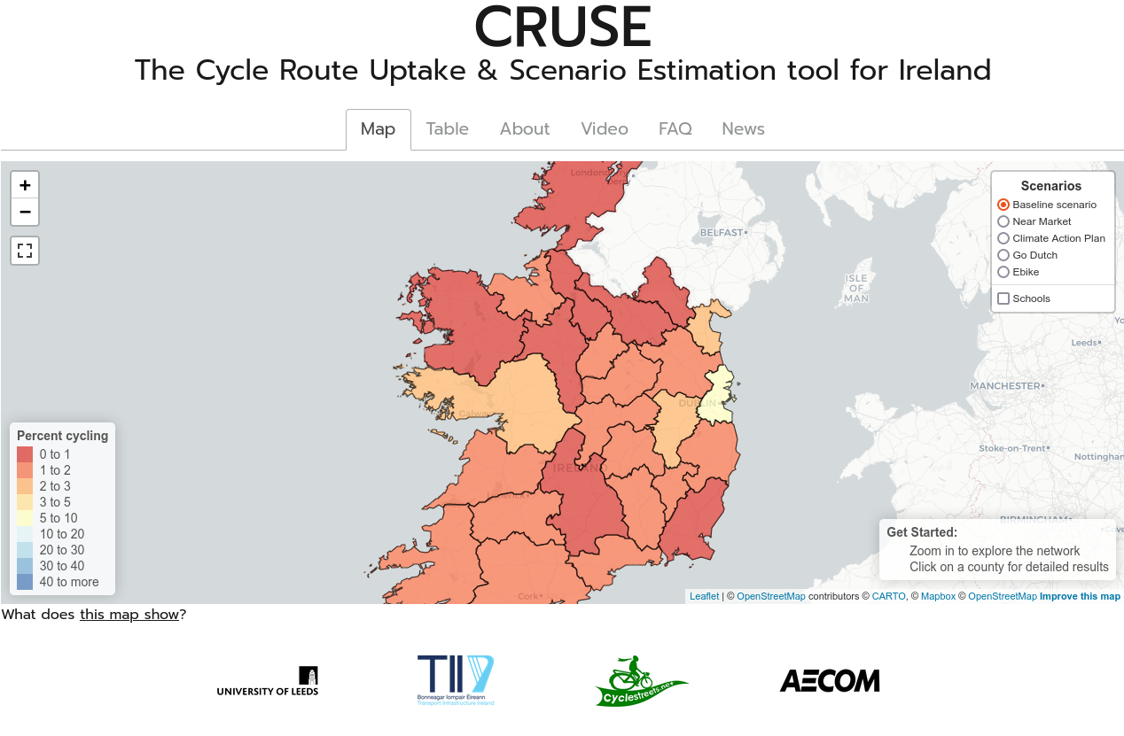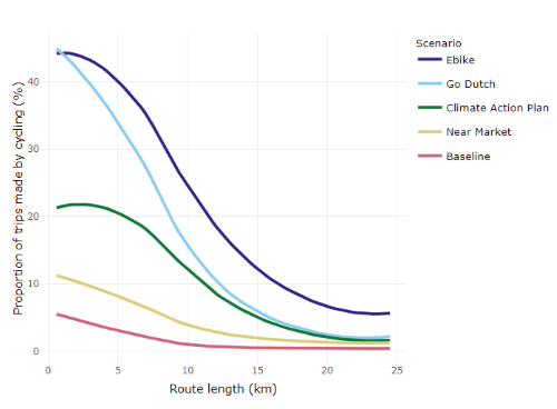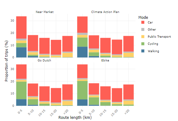 ] .date[ ### Sligo, 2022-09-22 ] --- ### The problem Source: [wantedinafrica.com](https://www.wantedinafrica.com/news/cape-town-has-worst-traffic-in-south-africa.html)  -- Or is that a symptom of a deeper problem? --- ## The problem: root causes  Source: ['Inside the black box' report](https://www.co.pierce.wa.us/DocumentCenter/View/755/A-GuideToModeling?bidId=) -- - Transport models were designed to support growth in car ownership and reduce journey times (Boyce and Williams, 2015) -- - 21^st^ Century priorities are very different -- - Climate science, air pollution and health force a shift in focus - The concepts of 'participatory democracy' and 'citizen science' mean there is a need for collaborative solutions -- --- ## The solution **New technologies mean that open access transport models are possible**  Source: A/B Street, free, open source, gamified transport planning software [github.com/dabreegster/abstreet](https://github.com/dabreegster/abstreet/#ab-street)  --- ## Direction of travel: WUIs  --- <!-- ##### Open Source Transport Tools. Source: [github.com/Robinlovelace/open-gat](https://github.com/Robinlovelace/open-gat#open-source-tools-for-geographic-analysis-in-transport-planning) -->  --- ## From open source to open access  - Transport models represent a leverage point in transport systems - New paper, Lovelace et al (2020) describes the emergence and possibilities for 'open access models' --- # The Propensity to Cycle Tools - Early prototype of the tool developed at Open Data Institute Leeds hackathon, 2015 - National deployment of the Propensity to Cycle Tool 2 years later ([PCT.bike](http://www.pct.bike/)) (Lovelace et al. 2017) <!-- --> --- ## Key aspects of the PCT - Based on open source code - Based on open data - Results published as open data - Publicly available web application encourages participation and evidence-based debate Open data and accessible results lead to participation. See https://twitter.com/search?q=cyipt.bike%2Frapid  --- ## How it works  --- ## Demo of the PCT Source: https://www.pct.bike/  --- # Active travel uptake modes The ActDev project: https://actdev.cyipt.bike/  - A/B Street - R integration, see https://github.com/a-b-street/abstr --- # CRUSE  --- # Purpose of the CRUSE tool To provide a web application for strategic cycle network planning for Transport Infrastructure Ireland (TII). This will support TII in: - Meeting road safety obligations under the EU RISM Directive - Appraisal of Active Modes PE-PAG-02036 in existing and future schemes The tool involves detailed route-level visualisations and a range of cycling uptake scenarios  --- # What trip types are included? .pull-left[ POWSCAR (2016 Census): - Travel to work - Travel to school/college Other (2017 National Household Travel Survey): - Social, personal and shopping trips Coming soon: - Recreational trips ] .pull-right[  ] --- # Cycle route networks Journeys are routed on the road and cycle path network https://www.cyclestreets.net/help/journey/routing/  --- # What is cycle friendliness? .pull-left[ A subjective measure representing the quality of a route segment for cycling. Using data derived from OpenStreetMap, it incorporates factors such as: - Type of road - Presence of cycle infrastructure - Whether the cycleway is shared with vehicles or pedestrians - Speed limits - Surface quality - Cycle signage - Barriers or obstructions - Cycle path width ] .pull-right[  ] --- # What are the quietest, fastest and balanced route types? - People's preferences for cycle infrastructure will vary. Children, less experienced and leisure cyclists may prefer traffic-free off-road routes, while experienced commuter cyclists may prefer direct routes. - Ideally, a cohesive cycle network should cater for this, with options for both comfort and speed - In the CRUSE tool, we present three types of route network - balanced, quietest and fastest - The balanced route network is shown by default  --- # Cycle uptake scenarios Results shown for County Kildare  --- # County statistics - trip distance and mode Results shown for County Kildare  --- # County level results  Full route networks are available on the downloads page --- # Any questions?  --- # References Boyce, D.E., Williams, H.C.W.L., 2015. Forecasting Urban Travel: Past, Present and Future. Edward Elgar Publishing. Beimborn, E., Kennedy, R., 1996. Inside the Blackbox: Making Transportation Models Work for Livable Communities. Citizens for a Better Environment. Lovelace, R., Parkin, J., Cohen, T., 2020. Open access transport models: A leverage point in sustainable transport planning. Transport Policy 97, 47–54. https://doi.org/10.1016/j.tranpol.2020.06.015 --- #### Appendix: Reproducibility and extending the tool - Find commuting desire lines in West Yorkshire between 1 and 3 km long in which more people drive than cycle: ```r plot(desire_lines["bicycle"]) ``` <!-- -->